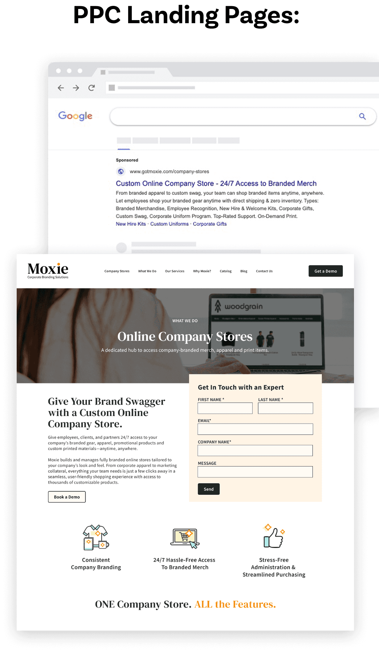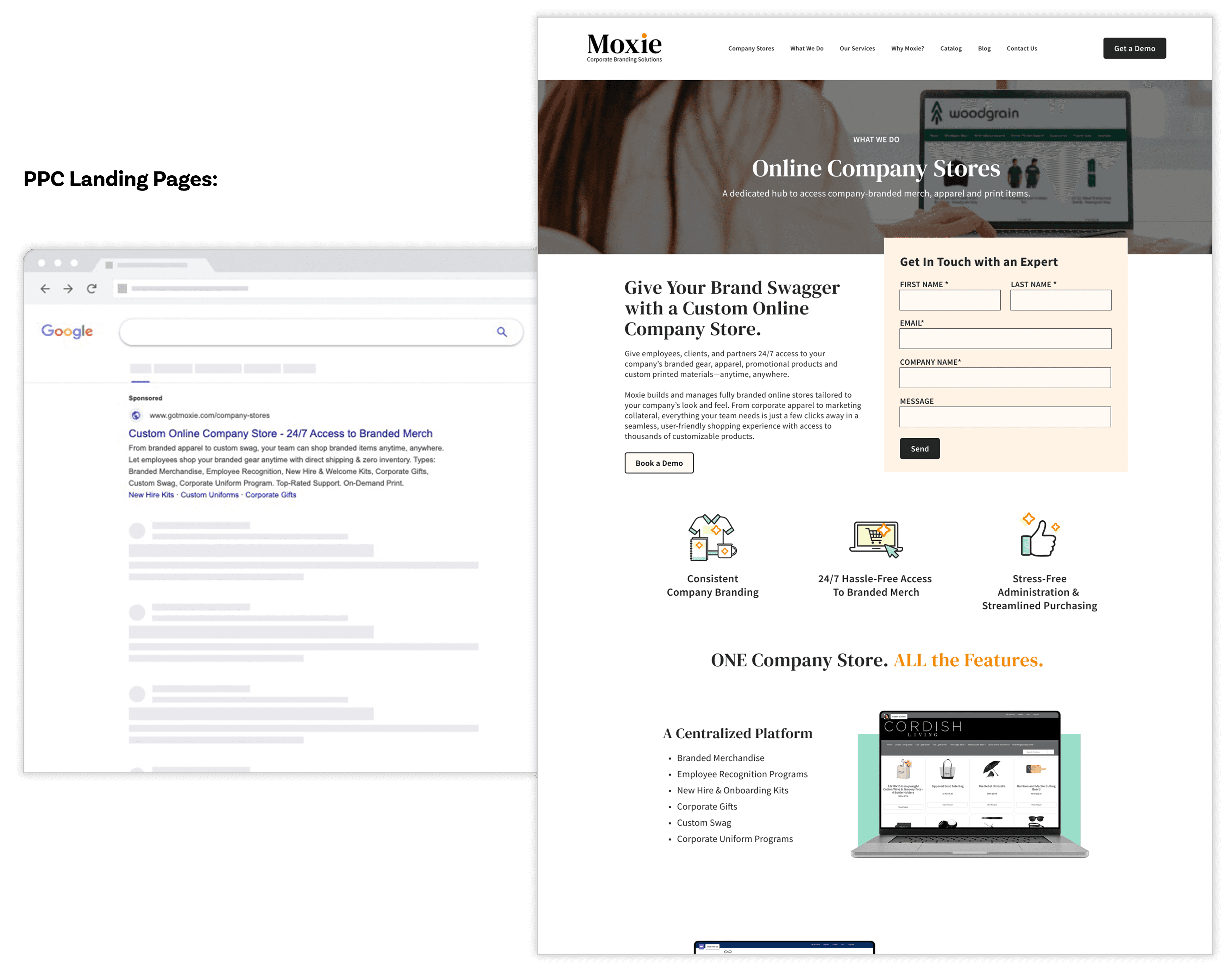Moxie is a one-stop shop for corporate-branded merch, custom apparel, print, and online company stores. Moxie had been experiencing a decline in online leads, had multiple competing website properties, and was spending money on PPC ads without any ROI. They turned to Ridge Marketing to help modernize their digital presence, maximize campaign performance, and drive more qualified leads.