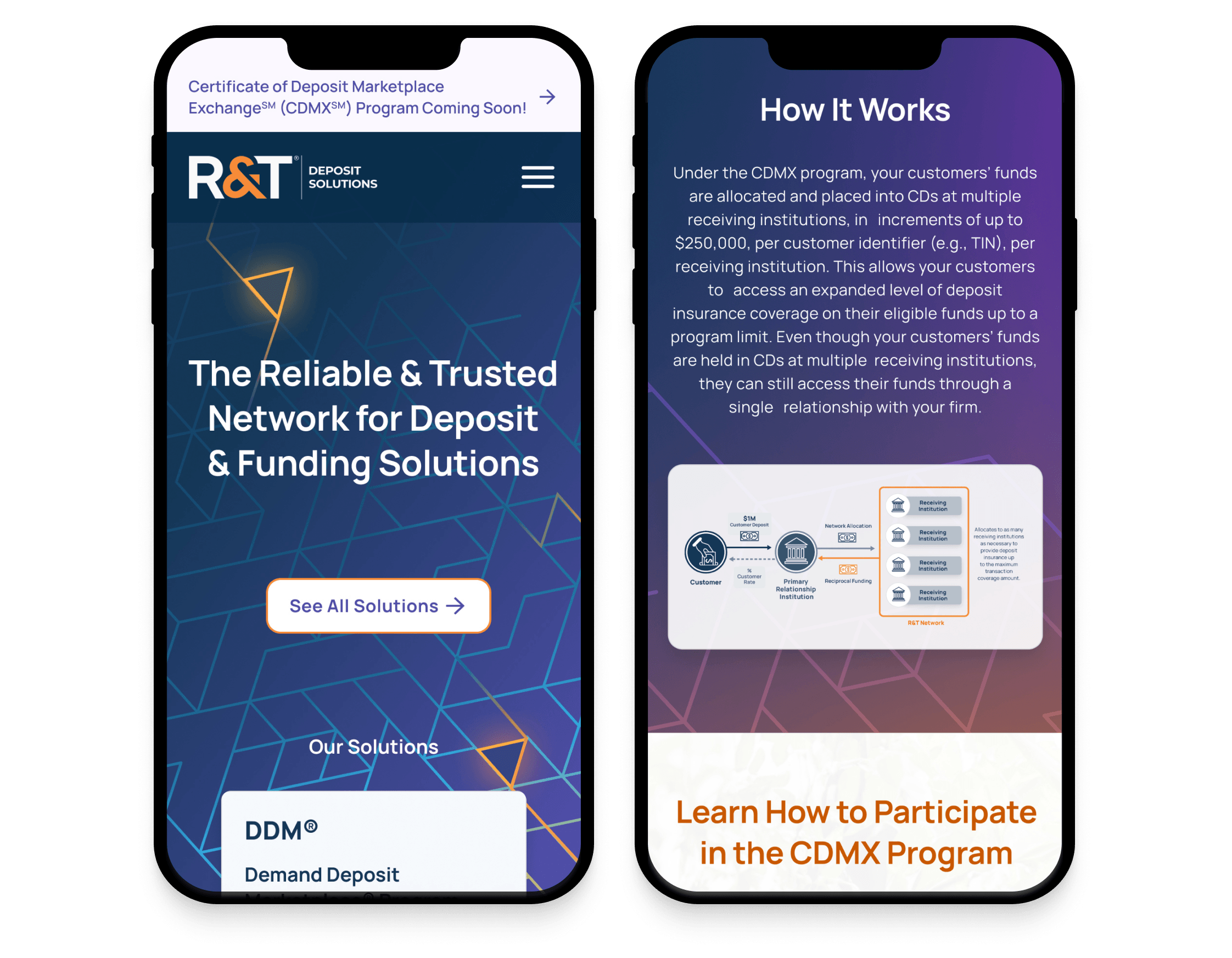 The new brand visuals and color scheme needed to be tech-forward, appealing to banks and wealth managers (their primary customers) and characterizing their simple solution to complex deposit funding needs. The complete rollout involved a full-service effort – branding, messaging, design, development, writing, SEO, project management and video.